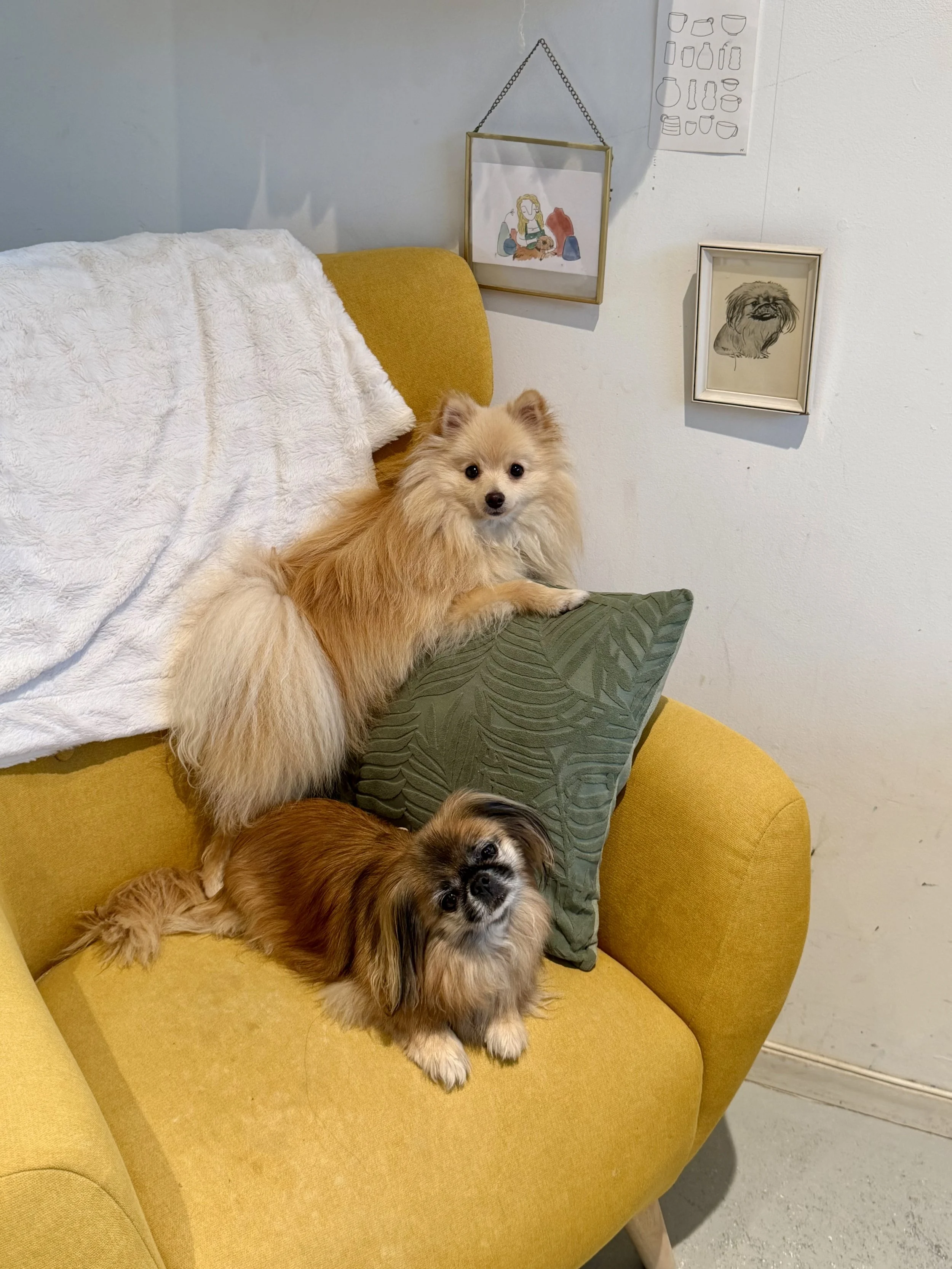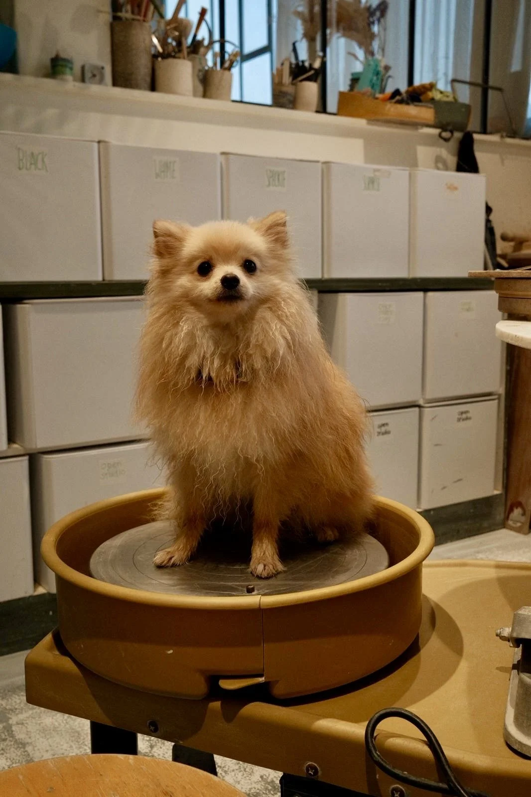 Als je je afvraagt wie het hondje op de fotoβs is: dat is mijn de altijd vrolijke hondje Mokum! Zij is regelmatig aanwezig in het atelier en beschikbaar voor knuffels en aaien en neemt ook vaak honden vriendjes mee. Eind 2023 heb ik nog een oud hondje geadopteerd uit het asiel, zijn naam is Opa. Hij is begin 2025 overleden maar is heeft een grote indruk achtergelaten in het atelier.